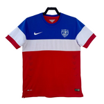The United States Men's National Soccer Team (USMNT) away shirt for the 2014 season, designed by Nike, features a bold and patriotic design. The jersey is divided into three horizontal sections: the upper part is royal blue, the middle features a white stripe, and the lower portion is red, reflecting the colors of the American flag. The team's crest is prominently displayed on the left chest, with the Nike logo on the right.
