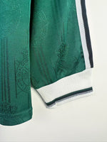 Designed by Adidas, the shirt features a deep green base with embossed club crests throughout the fabric, complemented by white collar and sleeve details. The Feiraco sponsor logo sits proudly across the chest, completing the classic 90s aesthetic.