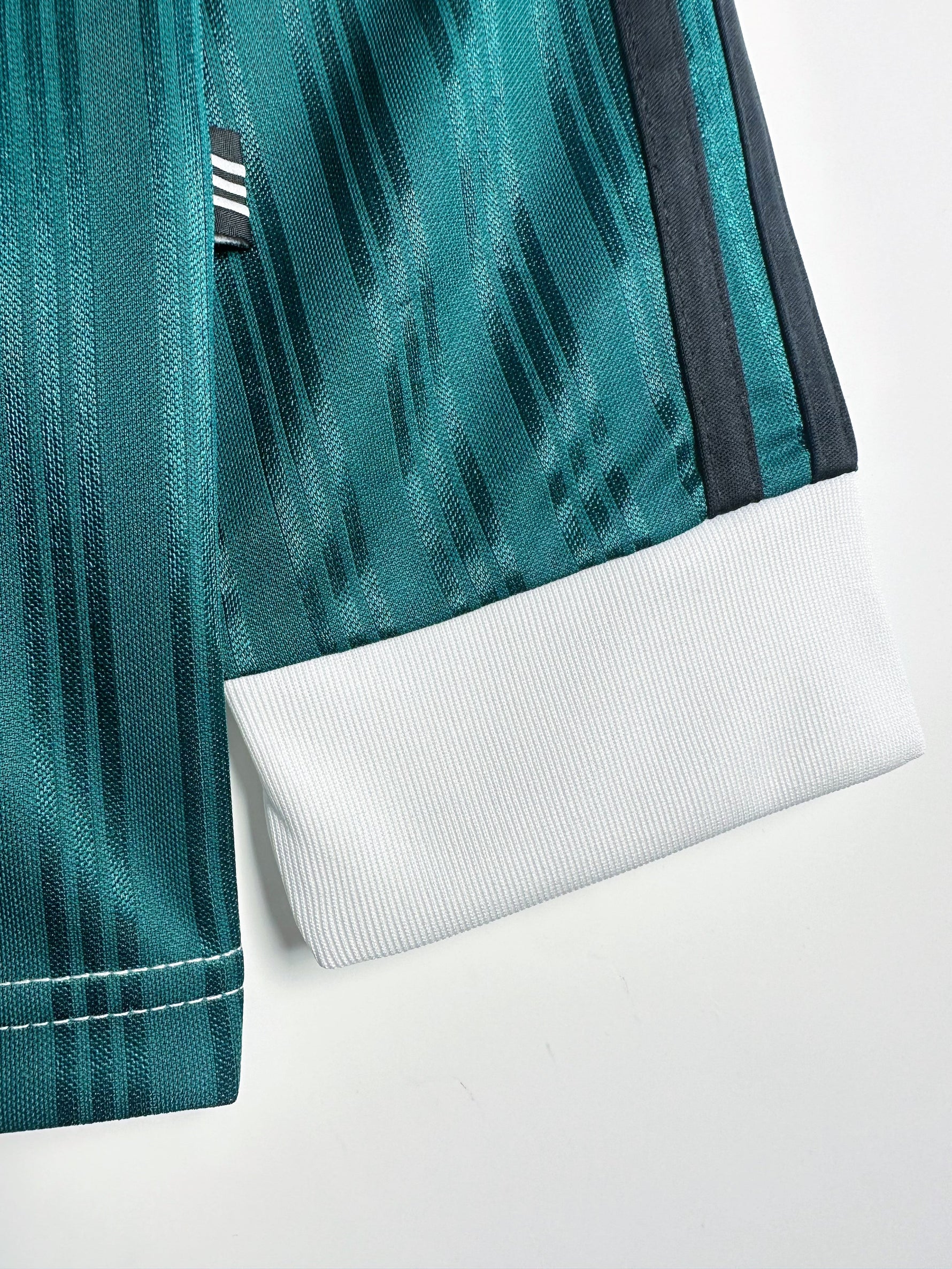 The 1995-1996 Liverpool away shirt is one of the most unique and recognizable kits in the club’s history. Designed by Adidas, this long-sleeve jersey features a striking half-and-half design, with one side in dark green and the other in white, accented by a distinctive vertical shadow pattern. The Carlsberg sponsor is boldly displayed on the chest, while the black Adidas three-stripes run down the sleeves, giving it a signature ‘90s football look.