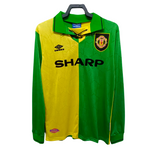 The Manchester United long sleeve third shirt from 1992 to 1994 is a distinctive piece that pays homage to the club’s origins as Newton Heath. Designed by Umbro, this jersey stands out with its unique green and gold halves, reflecting the original colors of Newton Heath before the club became Manchester United in 1902.