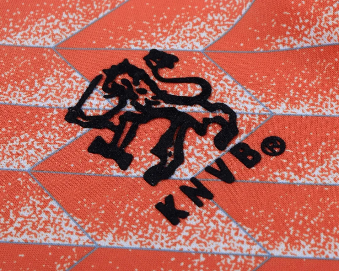 The Euro 1988 home kit is one of the most iconic football shirts ever, featuring the famous geometric pattern in classic orange. This was the jersey worn when Marco van Basten (#12) scored one of the greatest goals in football history, helping the Netherlands win their first major international title under the leadership of Ruud Gullit (#10) and Frank Rijkaard (#8).
