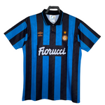 The Inter Milan 1992-94 home shirt, produced by Umbro, is a symbol of early ’90s football excellence. It features the classic black and blue stripes, with the Inter logo subtly embossed into the fabric for an elegant touch. The gold star above the club crest represents Inter’s dominance in Italian football, while the stylish Fiorucci sponsor stands out with its unique white script font.